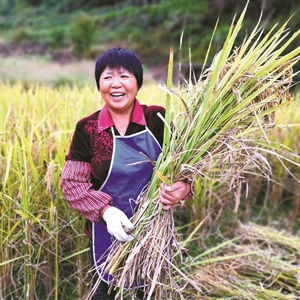 箭岭农户收割酵素水稻。 (余建文 摄)