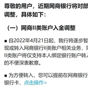 根据网商银行公告,自2022年4月21日起,该行将逐步暂停支付宝提现或转入网商银行Ⅱ类账户相关业务,同时网商银行Ⅱ类账户将仅支持本人绑定银行账户转入。