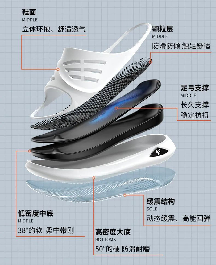 这款运动拖鞋就是拖鞋与跑鞋的结合体在市面劣质塑料拖鞋泛滥的情况下,它摒弃了廉价的PE、PVC料子转而采用更高级、更舒适的EVA材料。