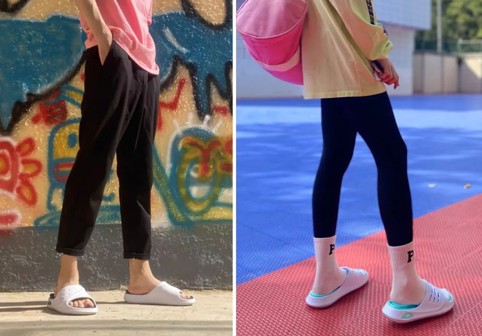看看实拍,短裤/鲨鱼裤+长袜和这款运动拖鞋真的很搭,运动气息十足,潮流范这不就来了。