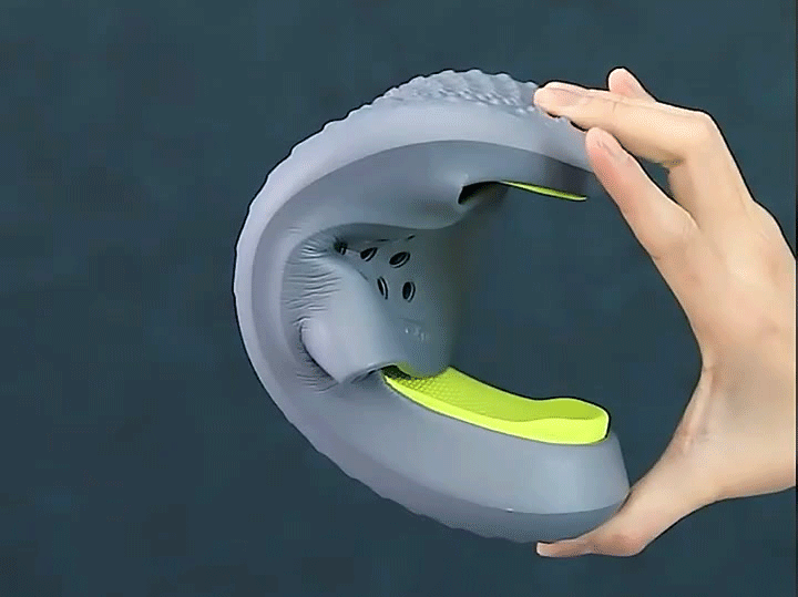 行走时仿生圆蛋上下形变,可减轻每次落地对脚和膝盖的冲击力,保护膝关节。