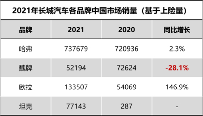 但在2021年4月,长城汽车较为短视地将坦克系列独立成为一个新的子品牌,这大大削弱了WEY品牌的产品力,导致WEY品牌2021年全年销量仅为52194辆,继续同比大幅下跌28.1%,在长城汽车整体销量中占比不足5%,在长城汽车四大乘用车品牌中(哈弗、欧拉、坦克、WEY)倒数第一。