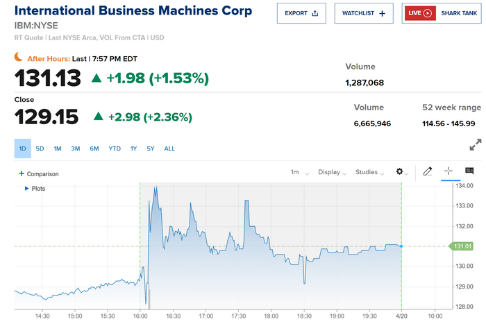 财联社上海4月20日讯,美东时间4月19日(周二)盘后,科技服务公司IBM公布了第一季度财报。财报显示,该公司第一季度营收和调整后每股收益均超出华尔街分析师此前的预期,其股价在盘后交易中一度上涨3%。