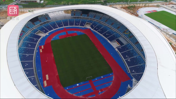 步入主体育场大门,混搭采用白、浅蓝、深蓝三种色调的座椅区清新亮眼。特别是左侧二层的座椅,通过相互穿插的红色,搭配出“体育让生活更美好”8个大字。我们了解到,主体育场可同时容纳5万余人,按座位规模,位列全省第三。