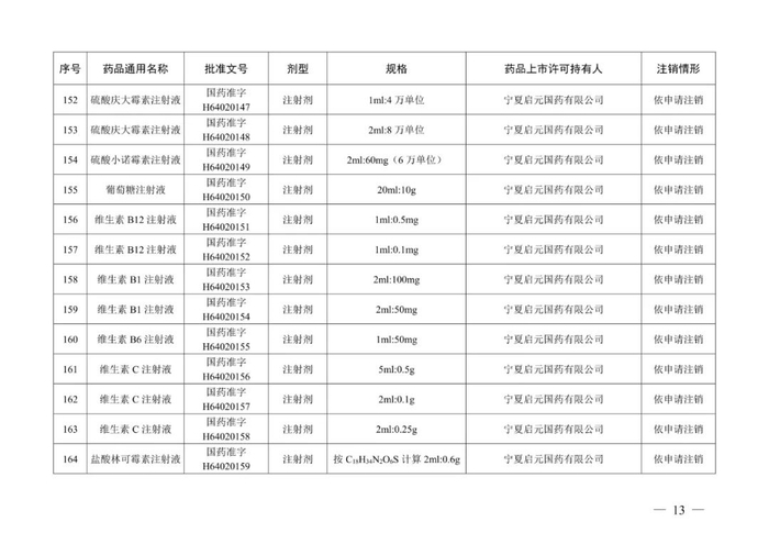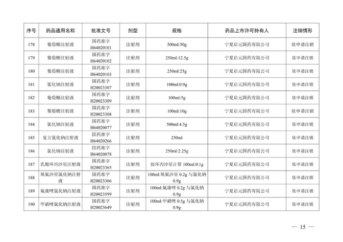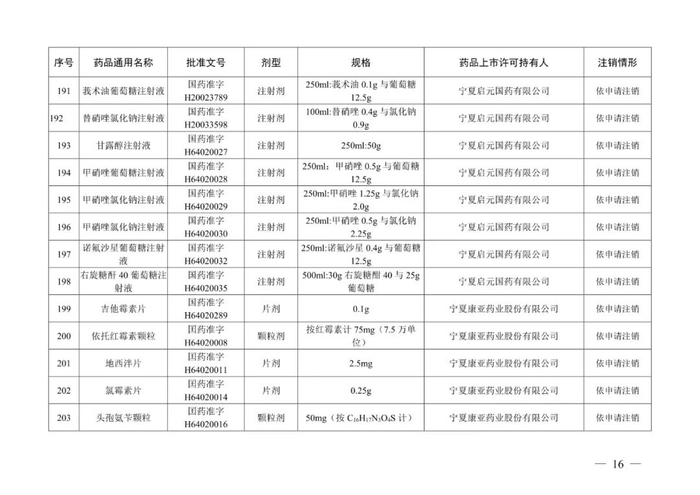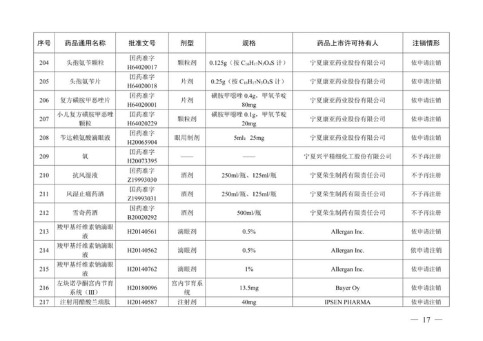 从注销情形来看,除宁夏兴平精细化工股份有限公司持有的氧和宁夏荣生制药有限责任公司持有的抗风湿液、风湿止痛药酒、雪奇药酒不予再注册,其余219个药品均是依申请注销。