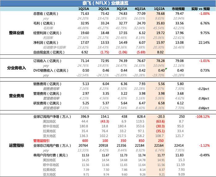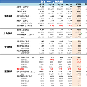 一季度奈飞的毛利率回到正常水平,营销投放也明显克制,使得更多的利润得到释放。但上季度管理层对2022年经营利润率指引为19-21%区间,因此预计后面几个季度,利润率会随内容排期变动而有所削弱。