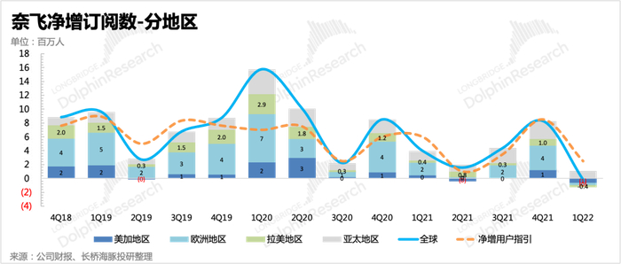 一季度奈飞全球订阅用户为2.22亿人,环比净流失20万,与管理层指引和市场预期的250万差距过大。对于二季度的指引——环比下降200万,则又是一个惊天巨雷。虽然二季度本身是淡季,但连续两个季度用户下滑,也会使市场重新审视奈飞的核心壁垒价值。