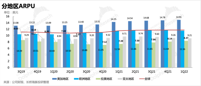 一季度在不同地区的单用户付费金额上,除了亚太地区,其他地区均有不同幅度的增长。