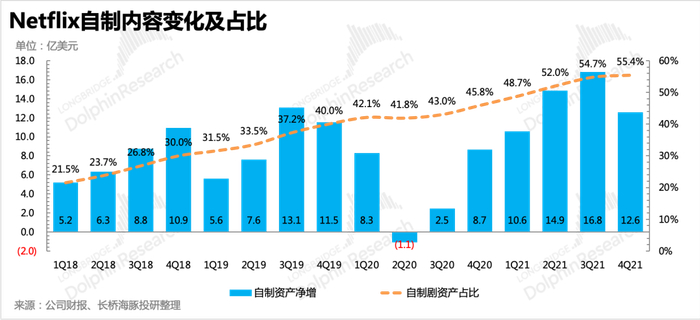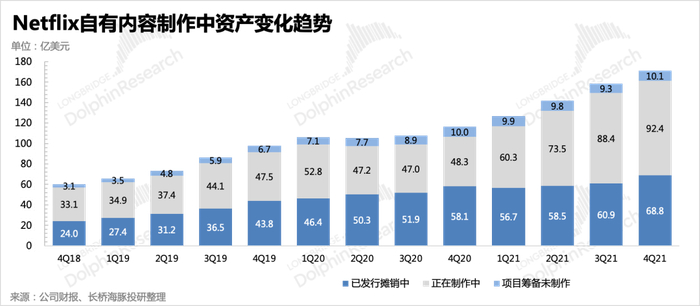在收入端增长有显而易见的压力之下,以及可能受去年底以来的Omicron疫情影响,奈飞在内容支出投入(流媒体内容现金支出)上,短期也表现出来继续放缓。截至一季度末,整体内容资产规模312亿,环比新增投入大幅萎缩。