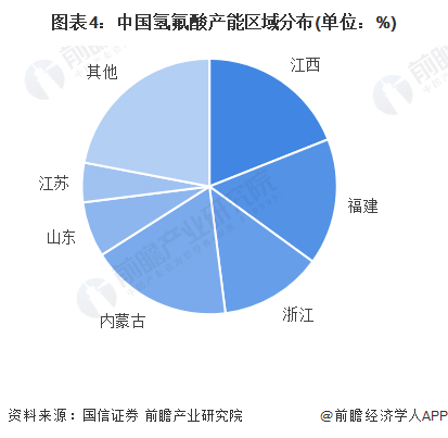 由于氢氟酸生产依赖萤石资源,因此氢氟酸生产企业主要集中在萤石资源较丰富的华东地区。具体来看,我国氢氟酸主要产能分布在江西省、福建省、浙江省和内蒙古等地区,其余地区占比均低于5%, 而前六大省份氢氟酸产能合计占比超过75%。
