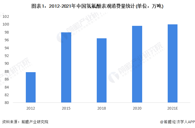 2012年中国氢氟酸表观消费量约为87.8万吨复合增长率为15.6%。2015年,我国氢氟酸表观消费量大幅增长,为97.94万吨。随后呈现波动变化,2020年我国氢氟酸表观消费量达99.59万吨,在创新高。前瞻估计2021年全年我国氢氟酸表观消费量也将达到100万吨左右,整体来看,我国氢氟酸需求呈波动变化。