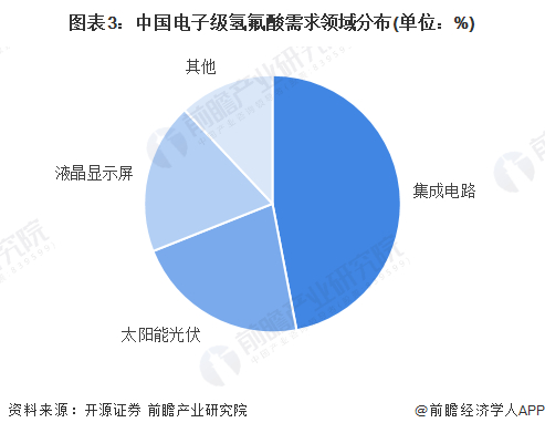 电子级氢氟酸则主要应用于集成电路(IC)和超大规模集成电路(VLSI)芯片中作为蚀刻剂和清洗剂用,按纯度可划分为5个级别。与传统工业级氢氟酸行业受限情况不同,近年来电子级氢氟酸行业发展受国家政策允许与鼓励,逆势而上、不断加码产能。目前,我国大部分的电子级氢氟酸用于集成电路。