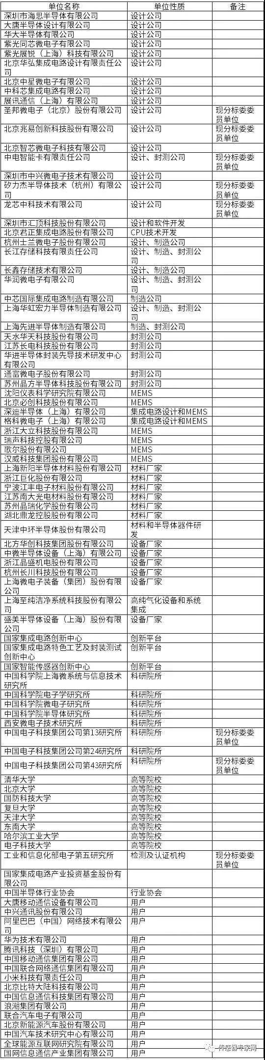 附全国集成电路标准化技术委员会全部公示筹建单位名单: