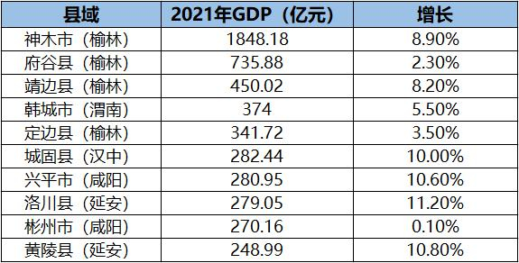 陕西GDP十强县及增速,表中数据来自各县官方统计公报。