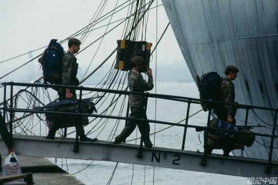 1982年5月12日,英国南安普敦,3500名英国士兵携带武器和装备登上豪华邮轮伊丽莎白二世号,准备前往马尔维纳斯群岛(英国称福克兰群岛)参加作战。