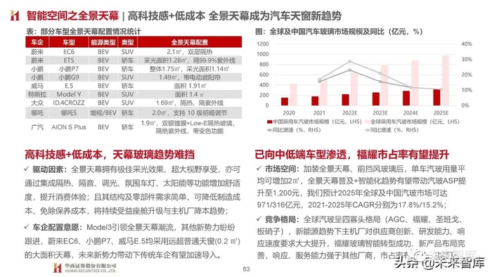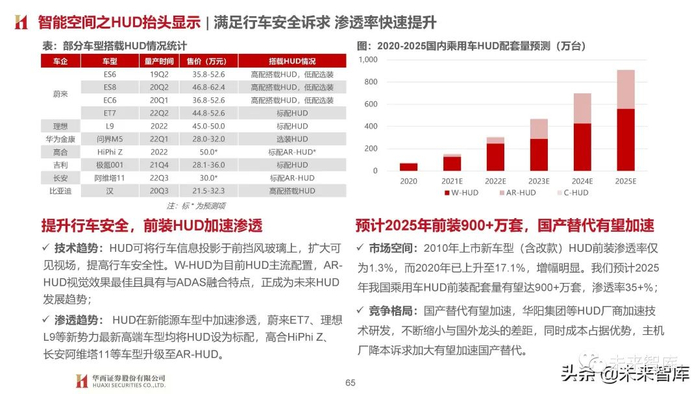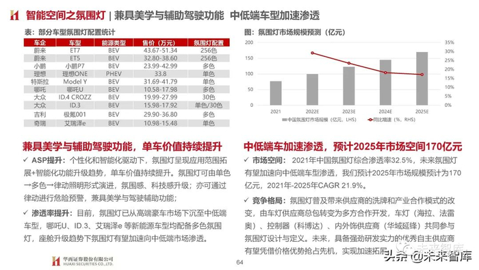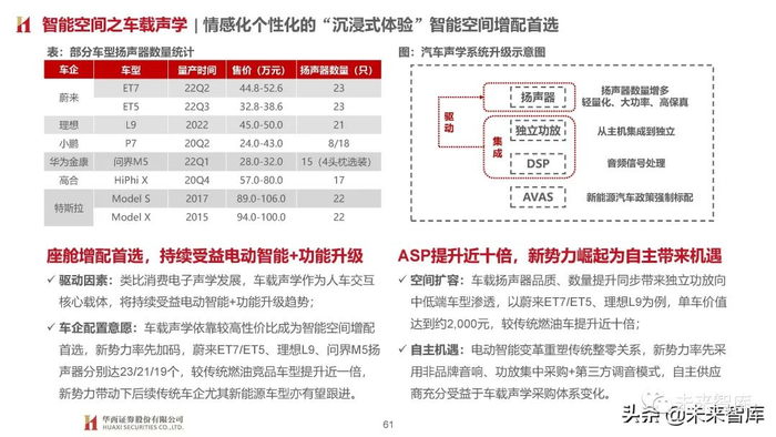 相同点:基于个性化场景定义(如影音、K歌、办公、游戏、旅行等)持续加码配置,造车新势力、传统车企高端智能电动品 牌均采用此策略,主要体现在车载声学、天幕、氛围灯、HUD等增量部件应用。我们认为座舱增配底层逻辑为技术迭代升级,在 智能空间快速发展的大背景下渗透率提升相对确定性较强,短期以高端车型应用为主,后续伴随成本下探有望加速向中低端尤其 新能源车型渗透;