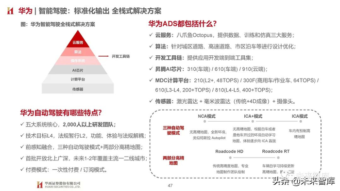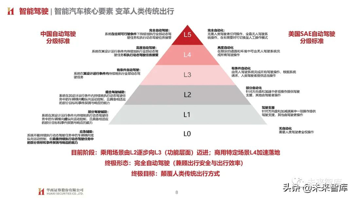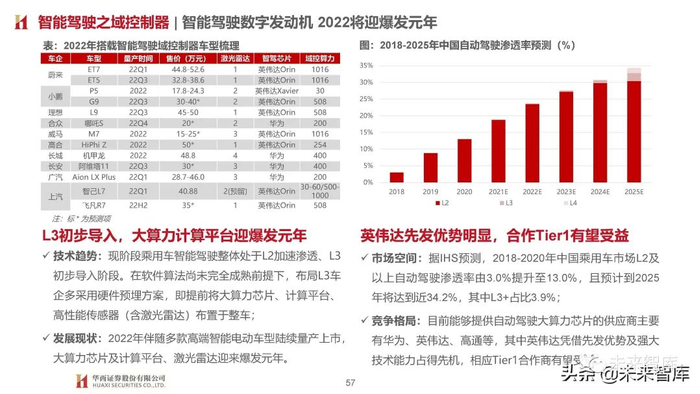 1)全球范围内目前仅特斯拉坚持纯视觉感知,北美现已取消毫米波雷达;2)国内新势力+传统车企针对L3及以上均采用大算力芯片及计算平台(基于英伟达/高通/华为)+激光雷达硬件预埋设计思路, 寄期通过后续软件OTA升级拓展运行区域,路径趋同;