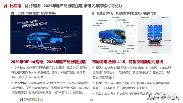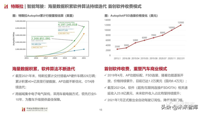 截至2021年末,特斯拉累计交付搭载AP硬件车辆229万辆;累计积累40+亿英里行驶数据,AP功能不断优化,OTA持 续迭代;跨越域集中电子电气架构,采用车载电脑方式,领先行业5- 10年,为整车升级提供最佳保障。