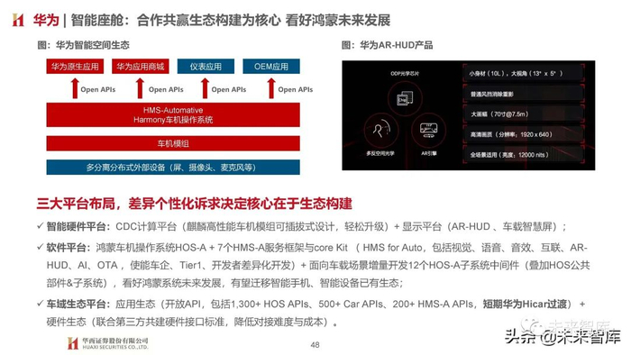 不同点:为形成差异化卖点,塑造品牌独特标识,各家车企在智能空间配置策略层面又略有不同,以蔚来、小鹏、理想三家新 势力为例:蔚来基于产业生态,黑科技配置较多,典型如AR/VR应用;小鹏定义智能第三空间,附属配套产品丰富,更像移动的 家;理想座舱配置(如顶配扬声器、五屏交互、豪华座椅)则更加体现针对性目标客户需求定义;