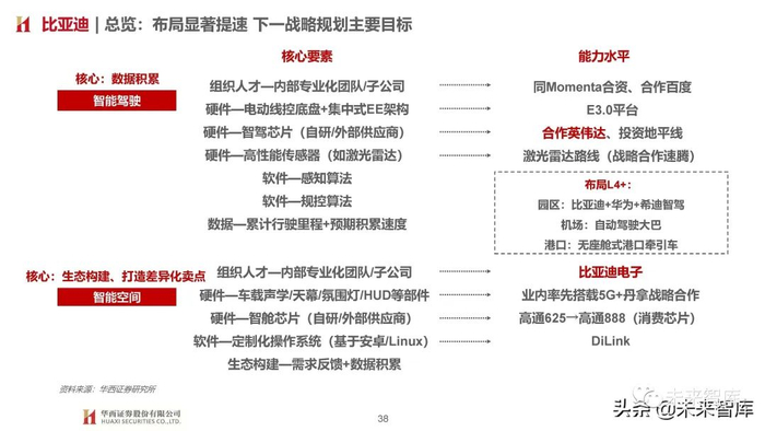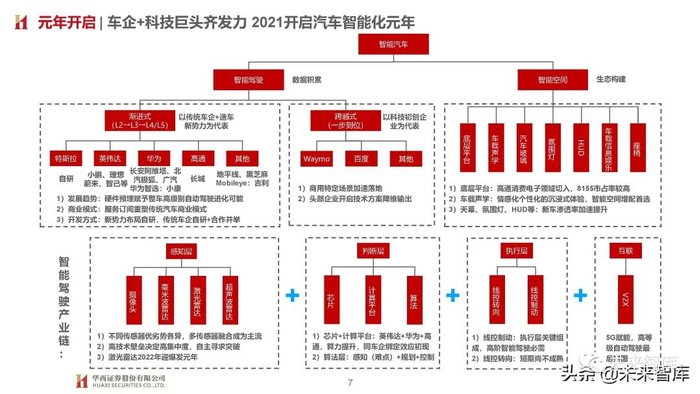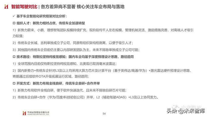 1)新势力布局软件全栈自研,便于软件快速迭代,且未来不排除自研芯片可能;2)传统车企自研+合作(华为/百度/科技初创公司)并举,L2(辅助驾驶ADAS)+L3及以上协同发力。