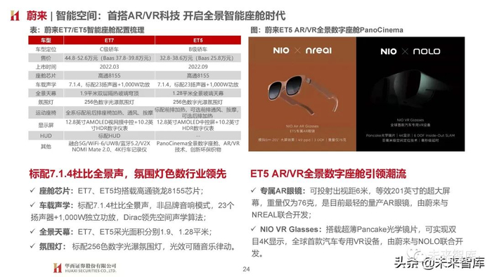 专属AR眼镜:可投射出视距6米,等效201英寸的超大屏 幕,重量仅为76克,是目前最轻的量产AR眼镜,由蔚来与 NREAL联合开发;NIO VR Glasses:搭载超薄Pancake光学镜片,可实现双 目4K显示,全球首款汽车专用VR设备,由蔚来与NOLO联合开 发。