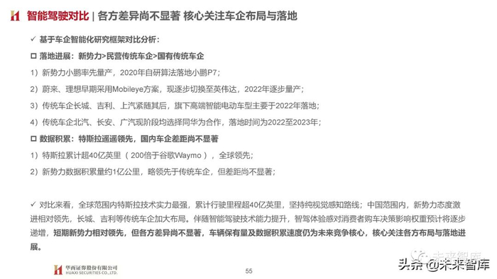 对比来看,全球范围内特斯拉技术实力最强,累计行驶里程超40亿英里,坚持纯视觉感知路线;中国范围内,新势力态度激 进相对领先,长城、吉利等传统车企加大布局。伴随智能驾驶技术能力提升,智驾体验感对消费者购车决策影响权重预计将逐步 递增,短期新势力相对领先,但各方差异尚不显著,车辆保有量及数据积累速度仍为未来竞争核心,核心关注各方布局与落地进 展。(报告来源:未来智库)