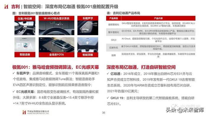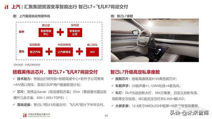 智能驾驶:L3自动驾驶逐步导入,解放驾驶员双手;智能空间:车载声学+天幕+氛围灯+HUD+智能座椅+大 屏多屏持续增配,打造家庭、公司之外第三空间;智能车联:人-车-路-云高效协同,场景无限拓展。