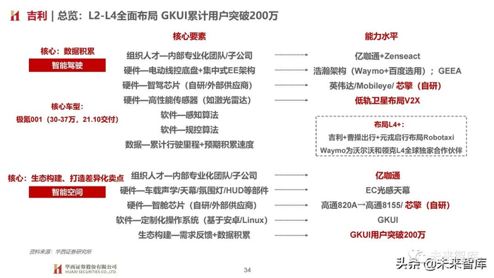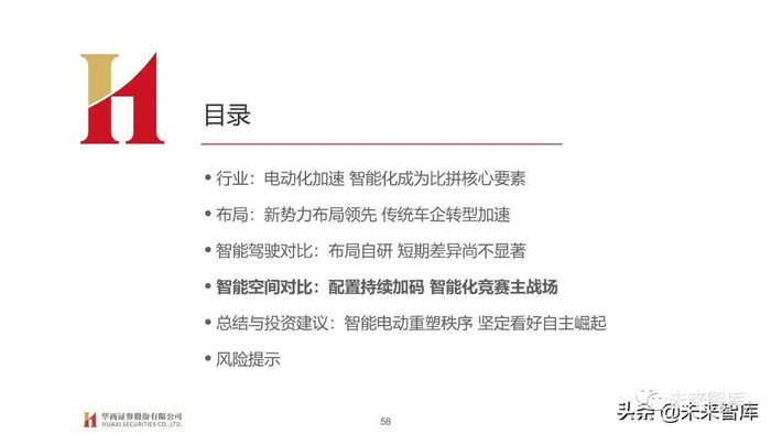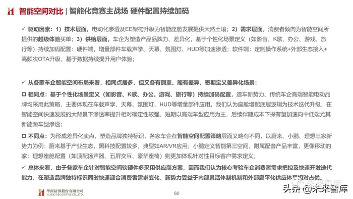 总体来看,由于各家车企针对智能空间软硬件多采用供应商方案,因而我们认为核心考验车企消费者需求把控及快速开发迭代 能力,在塑造品牌独特标识同时快速迎合消费者需求变化,新势力受益于内部灵活体制机制和外部扁平化供应体系相对占优。