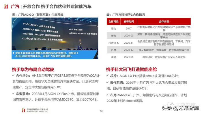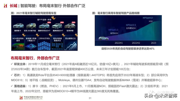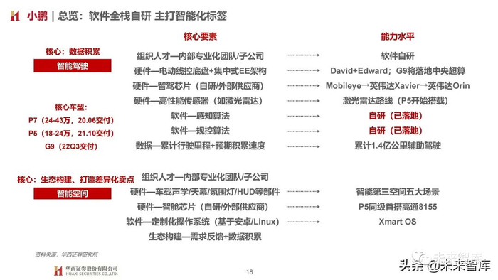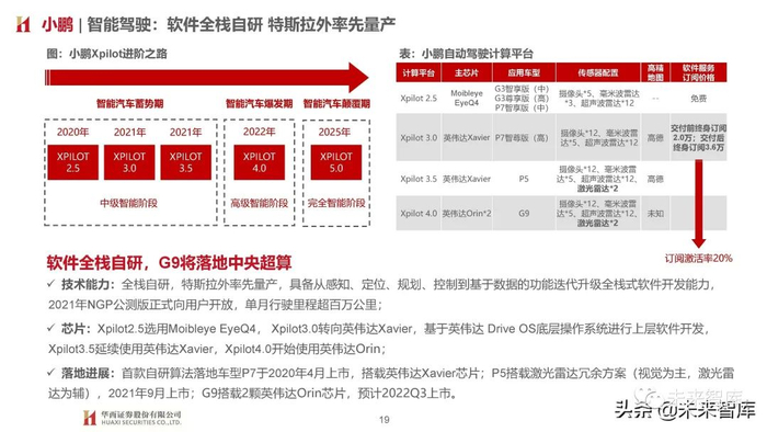 技术能力:全栈自研,特斯拉外率先量产,具备从感知、定位、规划、控制到基于数据的功能迭代升级全栈式软件开发能力, 2021年NGP公测版正式向用户开放,单月行驶里程超百万公里;芯片:Xpilot2.5选用Moibleye EyeQ4, Xpilot3.0转向英伟达Xavier,基于英伟达 Drive OS底层操作系统进行上层软件开发, Xpilot3.5延续使用英伟达Xavier,Xpilot4.0开始使用英伟达Orin;落地进展:首款自研算法落地车型P7于2020年4月上市,搭载英伟达Xavier芯片;P5搭载激光雷达冗余方案(视觉为主,激光雷 达为辅),2021年9月上市;G9搭载2颗英伟达Orin芯片,预计2022Q3上市。
