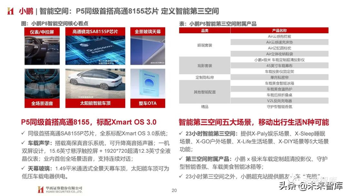 23小时智能第三空间:提供X-Paly娱乐场景、X-Sleep睡眠 场景、X-GO户外场景、X-Life生活场景、X-DIY场景等5大场景 功能;第三空间附属产品:小鹏 x 极米车载定制超清投影仪、守护型智能香氛、车载美食智能冰箱等;23小时第三空间之外,小鹏超充站提供鹏友人车“充能” 。