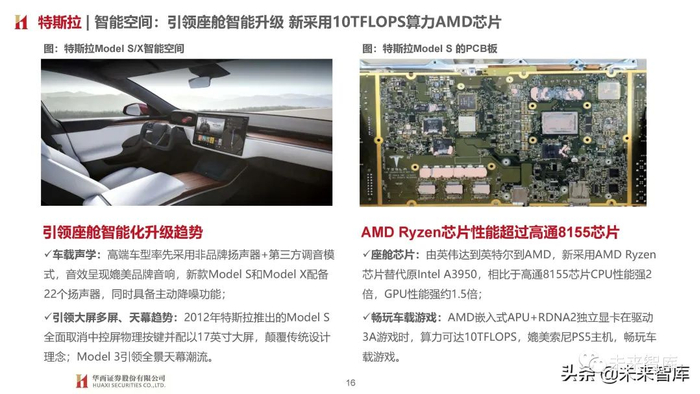 座舱芯片:由英伟达到英特尔到AMD,新采用AMD Ryzen 芯片替代原Intel A3950,相比于高通8155芯片CPU性能强2 倍,GPU性能强约1.5倍;畅玩车载游戏:AMD嵌入式APU+RDNA2独立显卡在驱动 3A游戏时,算力可达10TFLOPS,媲美索尼PS5主机,畅玩车 载游戏。