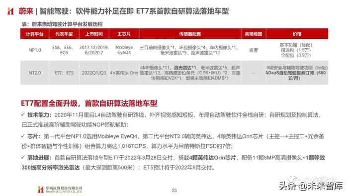 技术能力:2020年11月重启L4自动驾驶自研路线,补齐视觉感知短板,布局自动驾驶软件全栈自研;自研规划及控制算法, 已正式推送高阶辅助驾驶功能NOP领航辅助;芯片:第一代平台NP1.0选用Moibleye EyeQ4,第二代平台NT2.0转向英伟达,4颗英伟达Orin芯片(主控一+主控二+冗余备 份+群体智能与个性训练)组合算力高达1,016TOPS,算力水平为目前特斯拉FSD的7倍;落地进展:首款自研算法落地车型ET7于2022年3月28日交付,搭载4颗英伟达Orin芯片,配备11颗8MP高清摄像头+1颗等效 300线高分辨率激光雷达(最大探测距离500米);ET5预计将于2022年9月交付。