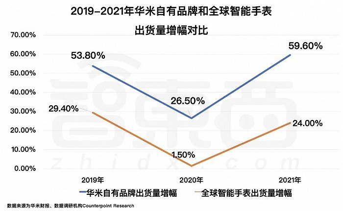 ▲2019-2021年华米科技自有品牌出货量增幅与全球智能手表出货量增幅变化对比(数据来源为华米财报、数据调研机构Counterpoint Research)