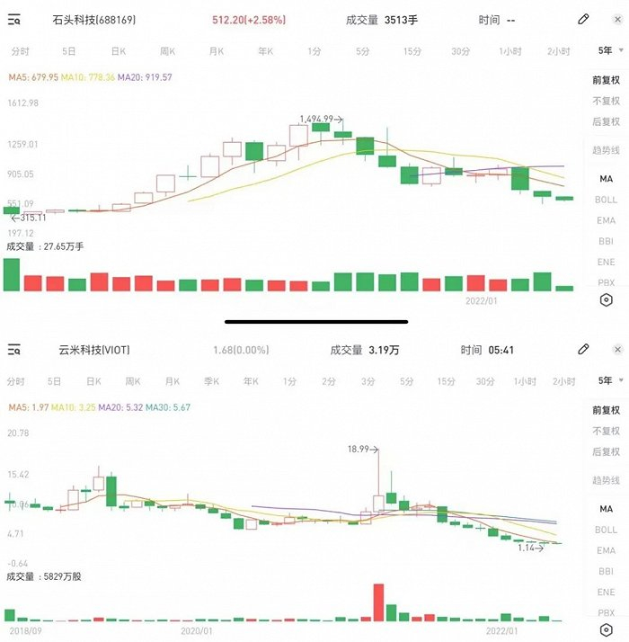 ▲2020年2月上市至2022年4月22日石头科技股价变化(单位:元)、2018年9月上市至2022年4月20日云米科技股价变化(单位:美元)