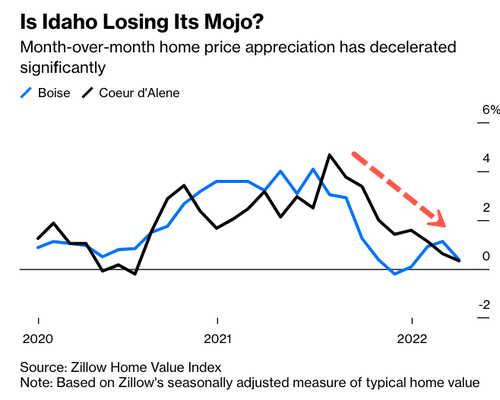 而当势头出现逆转时,首先受到冲击的是估值最高的市场。博伊西的房价正在趋于稳定,美国在线房地产公司Zillow数据显示,上个月博伊西平均房价仅上涨0.4%,远低于低于去年6月份的4.1%,成为美国100个最大住宅市场中房价最先显现出下降趋势的市场。
