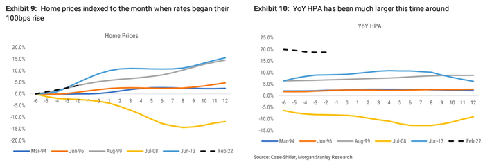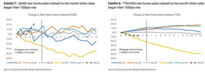 摩根士丹利分析师在此前的报告中进行了分析,大摩选取了自1990年以来,抵押贷款利率在半年内上升超过100个基点的时期,分别是1994年4月/8月、1996年6月/7月、1999年8月/10月、2008年7月和2013年6月/9月。