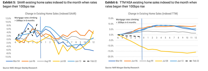 此前,摩根史丹利在报告中分析了美国房地产市场史上5个“贷款利率在半年内攀升超100个基点”时期的房价和销售情况,结合本次贷款利率走高的背景,得出: