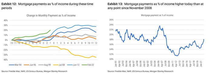 从房价来看,与房屋销售一样,房价在利率上升的六个月期间也会上涨。同时,该时期的年房价增值(HPA)往往在2-10%之间。不同的是,在2022年以来的几个月里,HPA已经接近20%。房价增长加上抵押贷款利率的大幅上升,导致购房者的每月房贷出现了前所未有的增长。