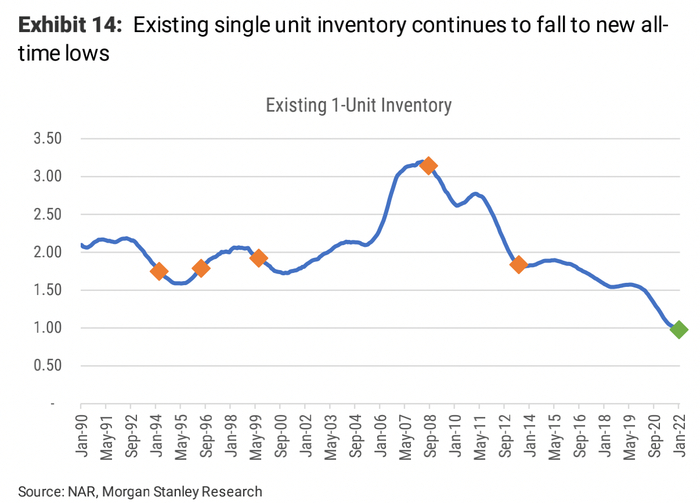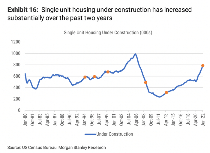 此外,正如前所述,在最初六个月之后抵押贷款利率持续上升,房屋销售将趋于疲软。考虑美联储将更激进地收紧货币政策,预计10年期美债收益率继续走高,抵押贷款利率也会跟随上涨。这也就意味着抵押贷款利率涨势还未结束,与去年相比,2022年现有住宅销售下降了6-7%。大摩预计,新房销售将更有弹性,从而推动库存增长5%左右。