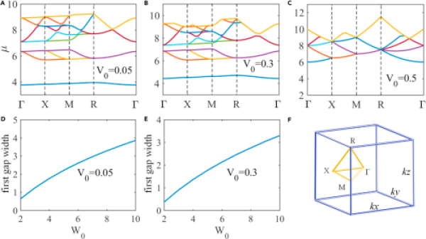 图1.三维PT立方晶格的线性能带谱图。(A、B、C)能带随晶格虚部的变化情况;(D、E)第一带隙宽度随晶格调制深度的变化情况;(F)在倒格子空间的第一布里渊区