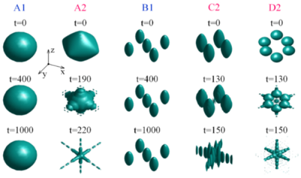 图4.三维耦合线性-非线性晶格中的物质波带隙孤子和孤子簇动力学演化行为。稳定的(A1)和不稳定的(A2)基本带隙孤子, 稳定的(B1)和不稳定的(C2)平面带隙孤子簇,不稳定的立体带隙孤子簇