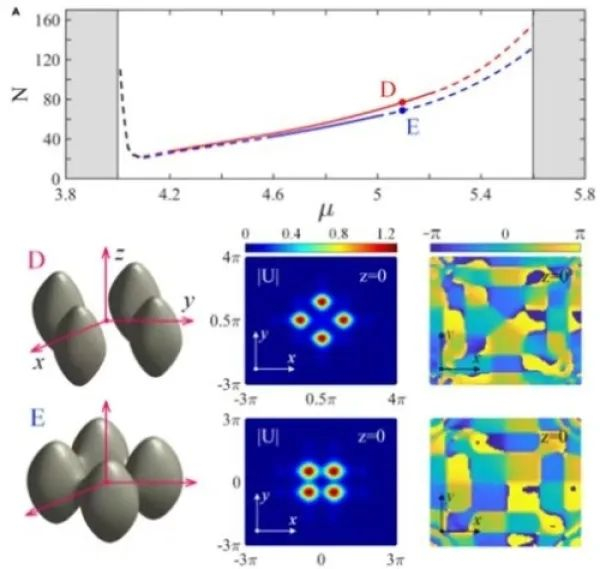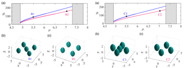 图3.三维耦合线性-非线性晶格中的非在轴(左)和在轴(右)物质波带隙孤子簇。原子数与化学势的关系(上行);由五个(下行,b)和四个(下行,c)基本物质波带隙孤子组成的孤子簇
