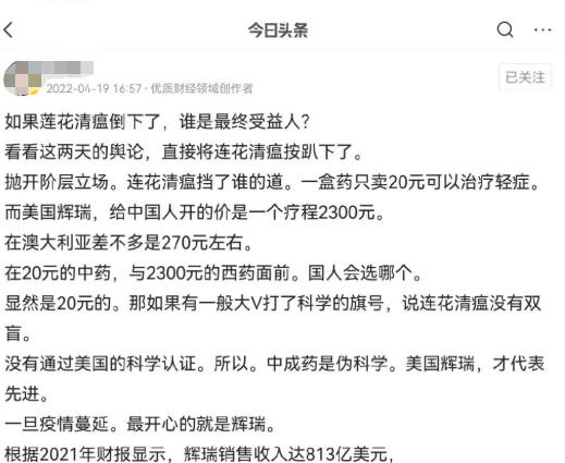 其实自从疫情以来,关于连花清瘟的讨论就没停过。针对这次网络舆论之争,互联网上也出现了很多不同的声音,大致可以分为:站连花清瘟派、站辉瑞派、中立派、阴谋派、科学派……