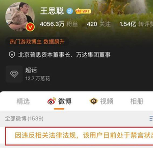 4月19日,王思聪微博被禁言。其个人主页显示:“因违反相关法律法规,该用户目前处于禁言状态”。