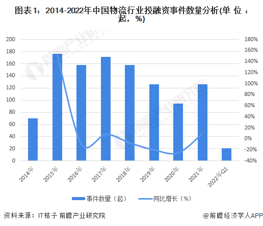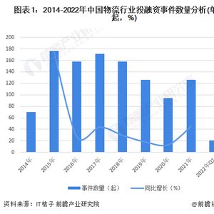 2014-2021年,全国物流行业投融资事件数量呈现波动变化的态势,整体在2015-2018年达到高峰,随后投融资事件数量有所下降。2021年,全国物流行业投融资事件超过120起,同比2020年增长10%;2022年第一季度,全国物流行业投融资事件累计超过20起。