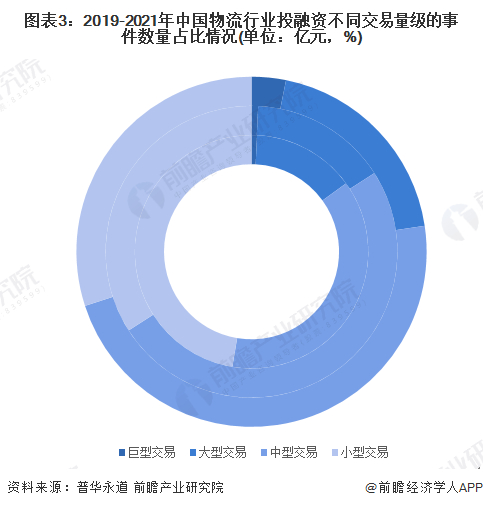 2019-2021年,全国物流行业投融资市场中,1亿元以上量级的投融资事件逐渐增多,其中在2021年,全国物流行业投融资市场共有6起100亿元以上的投融资事件,物流行业头部企业加速整合,导致投融资交易量级大型化趋势明显。