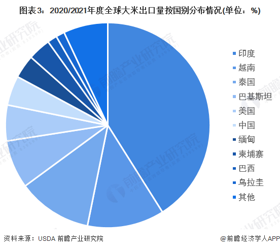 从全球大米出口国别分布情况来看,2020/2021年度,印度大米出口量为21191千吨,占比超过41%;其次为越南,大米出口量为6272千吨,占比超过12%;第三为泰国,出口量为6062千吨。