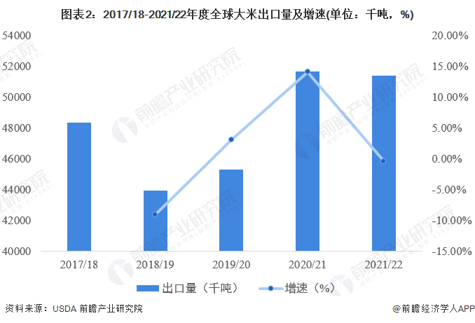 2017/18-2020/21年度,全球大米出口量波动较大。2020/21年度,全球大米出口量达到了51631千吨,较2019/20年度上涨14.04%。根据美国农业部于2021年3月的预测数据,2021/22年,全球大米出口量将小幅下降。