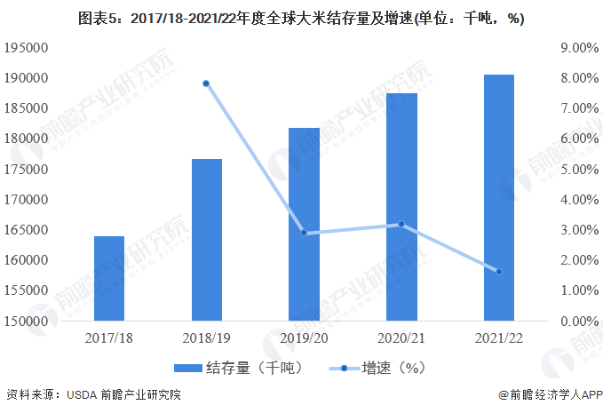 2017/18-2020/21年度,全球大米结存量增长趋势。2020/21年度,全球大米结存量为187510千吨,相比2019/20年度上升3.17%。根据美国农业部于2021年3月的预测数据,2021/22年,全球大米结存量将超过1900万吨。