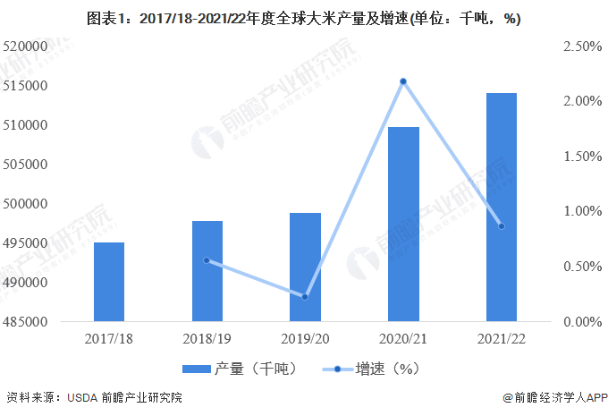 2017/18-2020/21年度,全球大米产量呈上升趋势。2020/21年度,全球大米产量为509677千吨,相比2019/20年度增长2.18%。根据美国农业部于2022年3月的预测数据,2021/22年,全球大米产量将超过5.1亿吨。